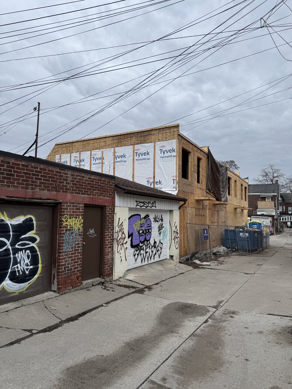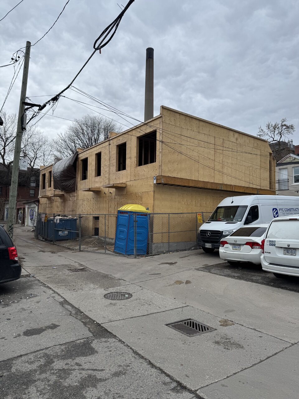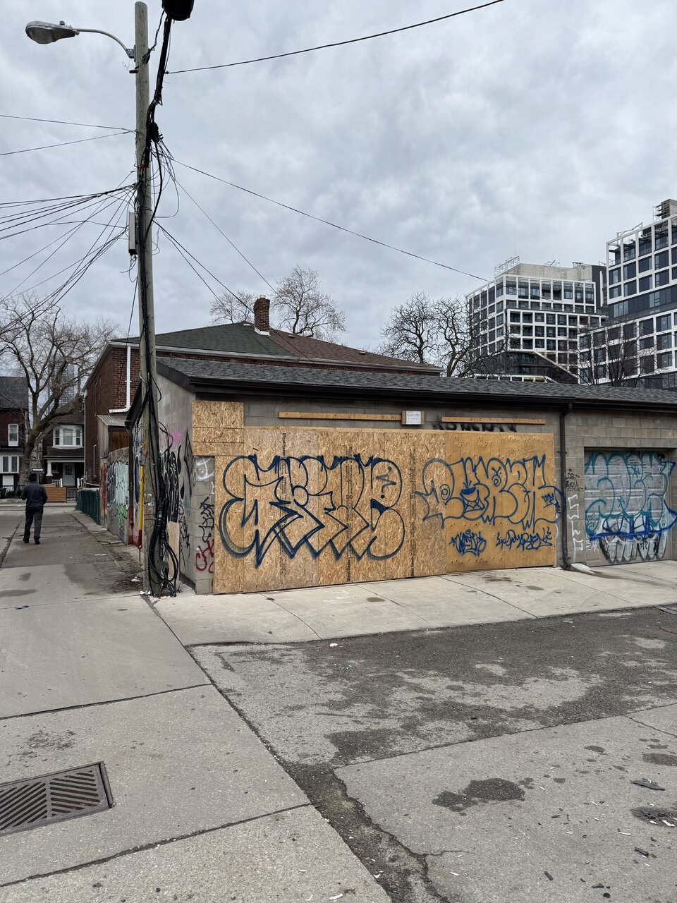 I wrote a paper on this about 10 years ago! Homeowners should band together to allow a single builder to develop a row of laneway houses across their properties in order to increase the economy of scale because these things are not cheap. Glad to see an example of it! I also suggested that the design work be done by new architects/students in order to vary the design style and decrease the costs as well.Taken 20 March. This is on Wales northeast of Bellevue and Dundas. Row of units going up and a new laneway house on the opposite corner.