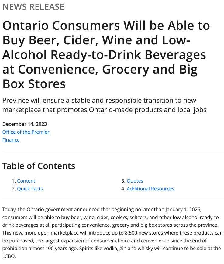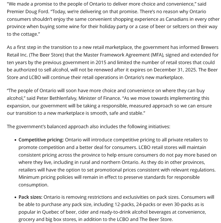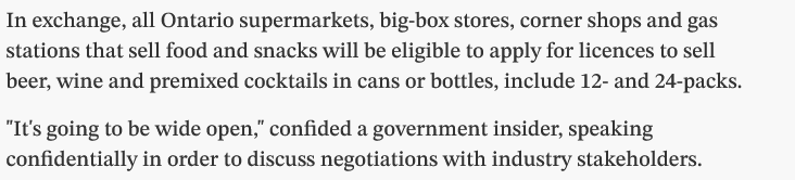 One point touched on was the need for oversight and enforcement to prevent under-aged persons from accessing liquor. While it might be better at grocery stores and perhaps chain convenience stores, a minimum wage teenager or recently landed immigrant is going to be hard pressed to really care. While everyone agreed that the government 'should' ensure regulatory oversight, having worked for for the government, including the AGCO specifically, I highly doubt we will see much in the way of proactive enforcement. All governments like having regulations, but they don't like regulating.