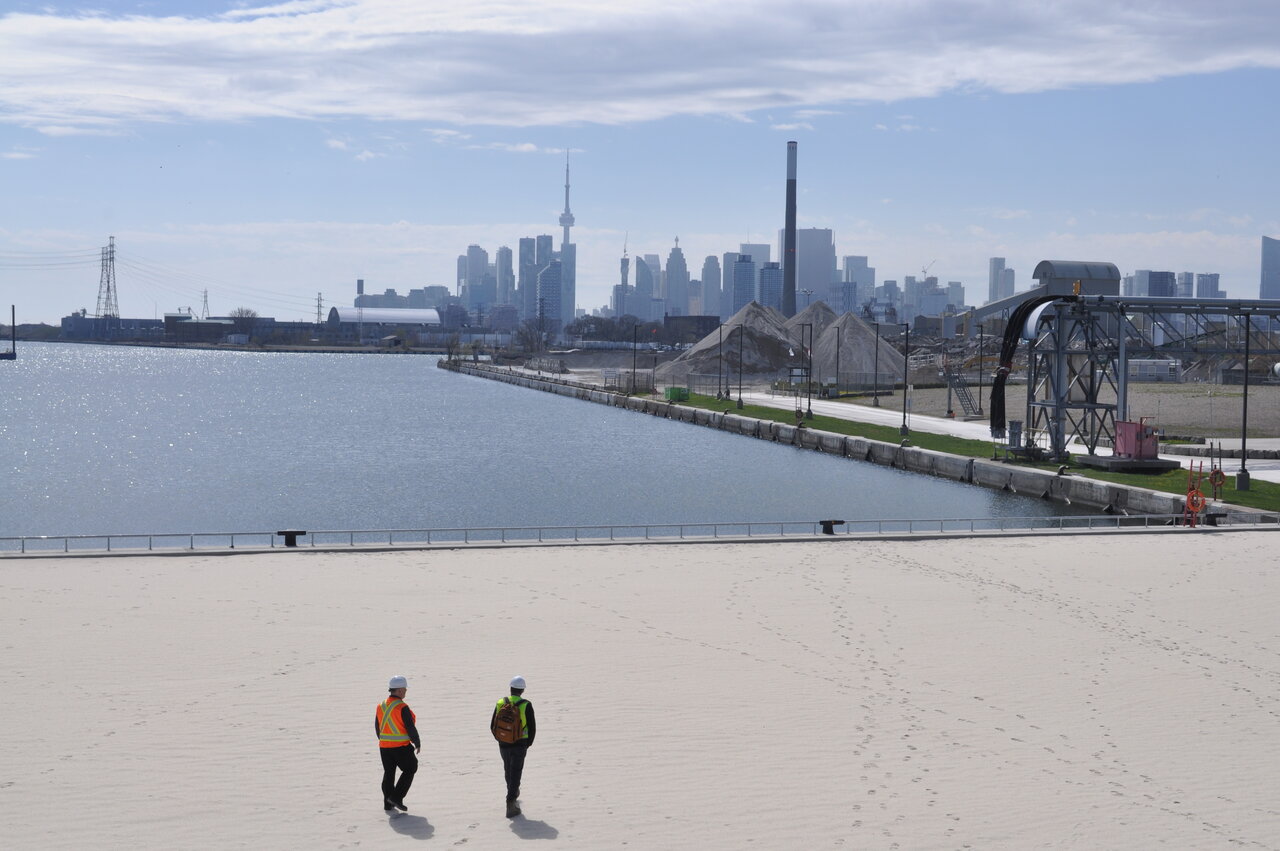 The green strip to the west is part of a larger property within the East Port industrial district that is actively used for offloading cement from lake freighters to the silos (see below from 2023).^Great update! What is the strip of green and lampposts running west from the park? Is this part of the plan or a separate feature? Thanks!