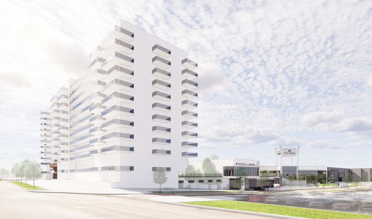 A proposed 12 & 12-storey residential building and expansion of the existing commercial building designed by Zeidler and WZMH for Cadillac Fairview on the northeast corner of Upper Wentworth Street and the Lincoln M. Alexander Parkway in Hamilton's Thorner neighbourhood. A new Hamilton HSR Bus Transit Hub is proposed along with the development.