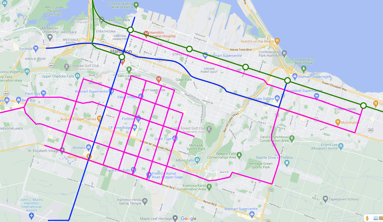 • Two trunk LRT lines (the current proposed route between McMaster and Eastgate (except extended to Confederation GO) and a north-south route up the mountain and towards the airport (even if the airport seems a bit of a white elephant)