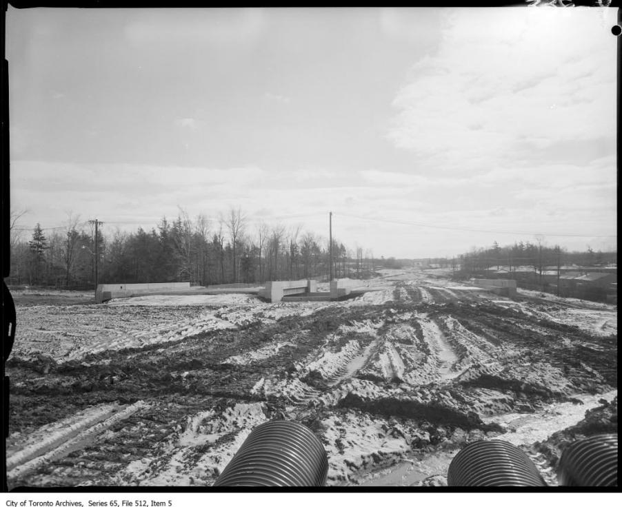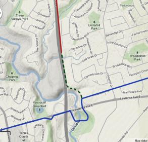 What I can't figure out, when I look at the topographic maps on Google, is why they stopped where they did. They took Woodbine south across the more substantial valley around where Brookbanks is now, but then stopped at the top of a less challenging one. If they'd crossed that, half a mile along the heights and across a minor dip would have brought Woodbine down to Lawrence Avenue pretty much where Old Lawrence Avenue climbed up the hill and headed east. I really don't get why they didn't close a fairly minor gap in the road system like that.