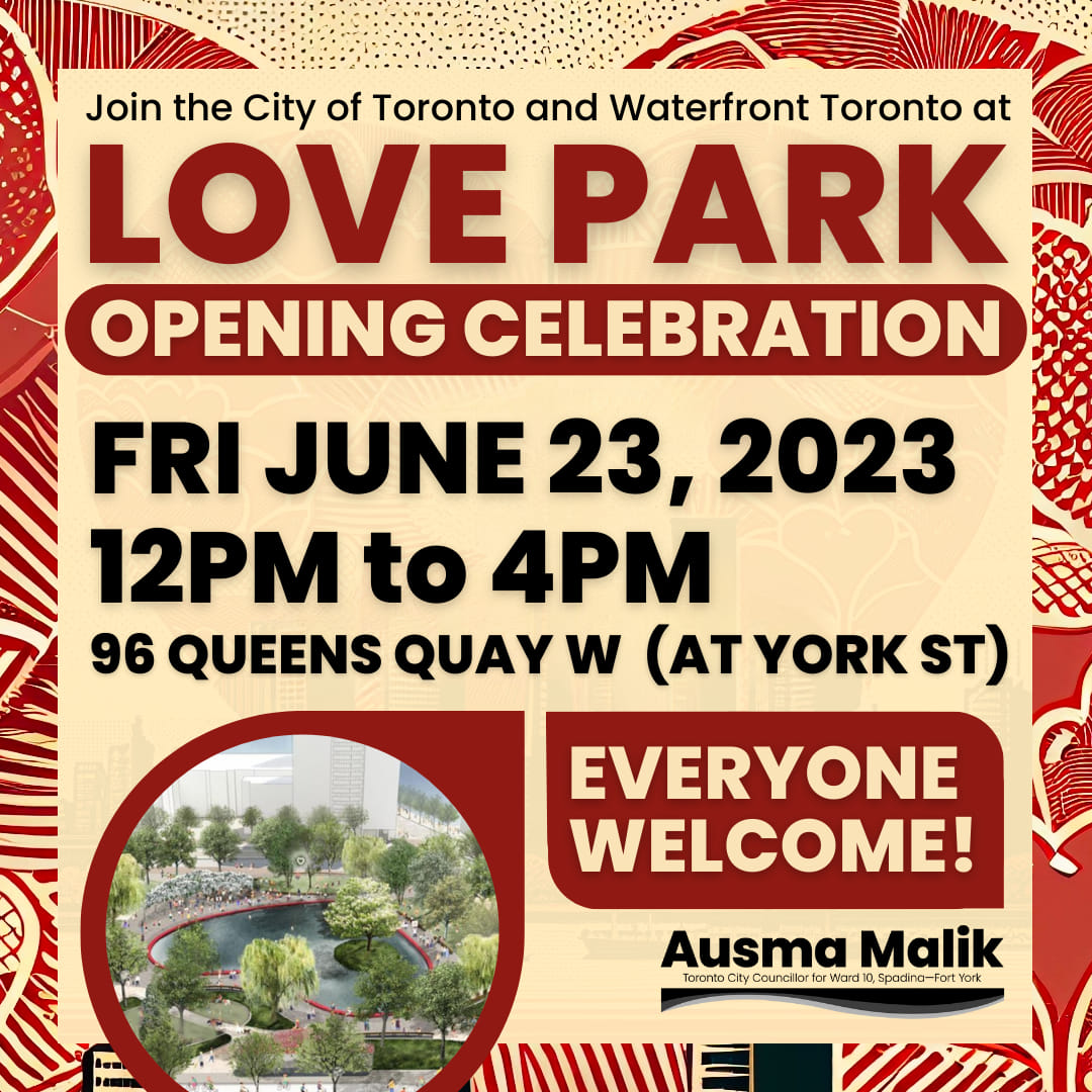 Love Park will officially open on Friday, June 23rd! Please join The City of Toronto and Waterfront Toronto for the official opening event from 12 – 4 pm. There will be live music, guest speakers, free snacks and fun activities for the whole family!