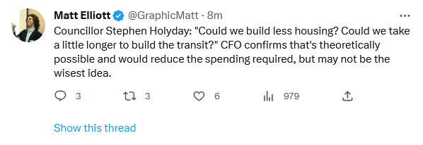 Reflecting on how John Tory resists working with responsible, reasonable progressive councillors (despite claiming he's Mr. Moderate) but spent years, terms, playing nice with and indulging Holyday, putting him in positions, and even making him a Deputy Mayor for I'm not sure what — for doing his best to be the most cruel, most anti-housing, most obstructionist, most anti-anything good on council? Same with DMW, Nunziata. If there's an aggressively awful clearly a toxic and unkind conservative on council, you know John Tory will have a position for them, but responsible progressives, no.Councillor Holyday is special and he knows it. Here's his question/suggestion to staff on how to address fiscal challenges: