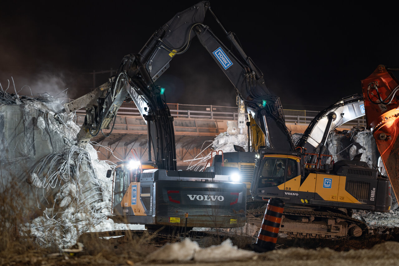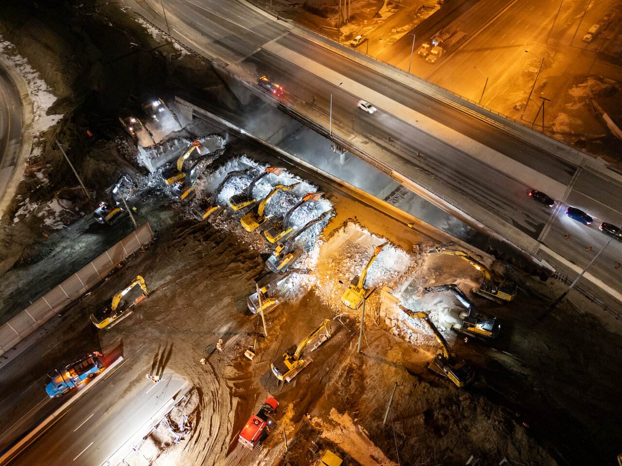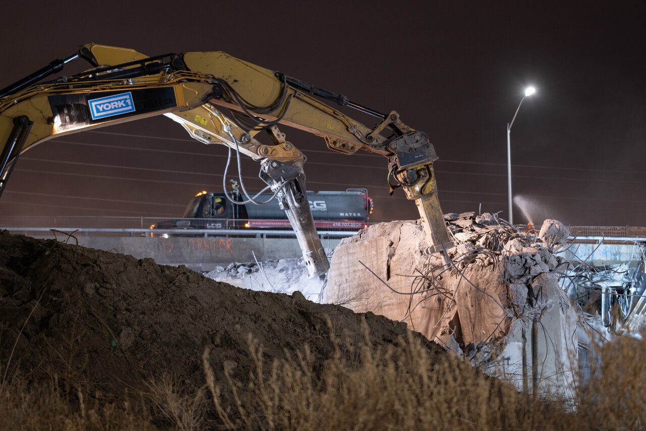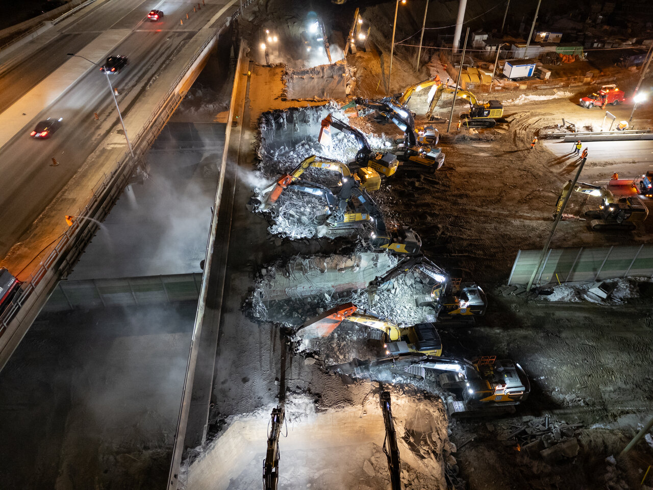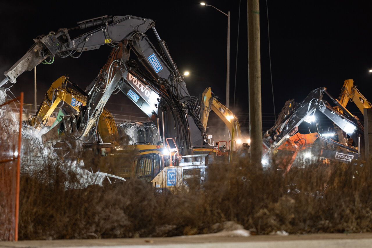 Great shots.Demo started at 9pm with sand being laid down from in the hour prior. When I left at 1am, the deck was already down with 15-17 excavators were attacking it at one point. Once the machine with shears were done cutting, they swapped out attachments for buckets to move debris.