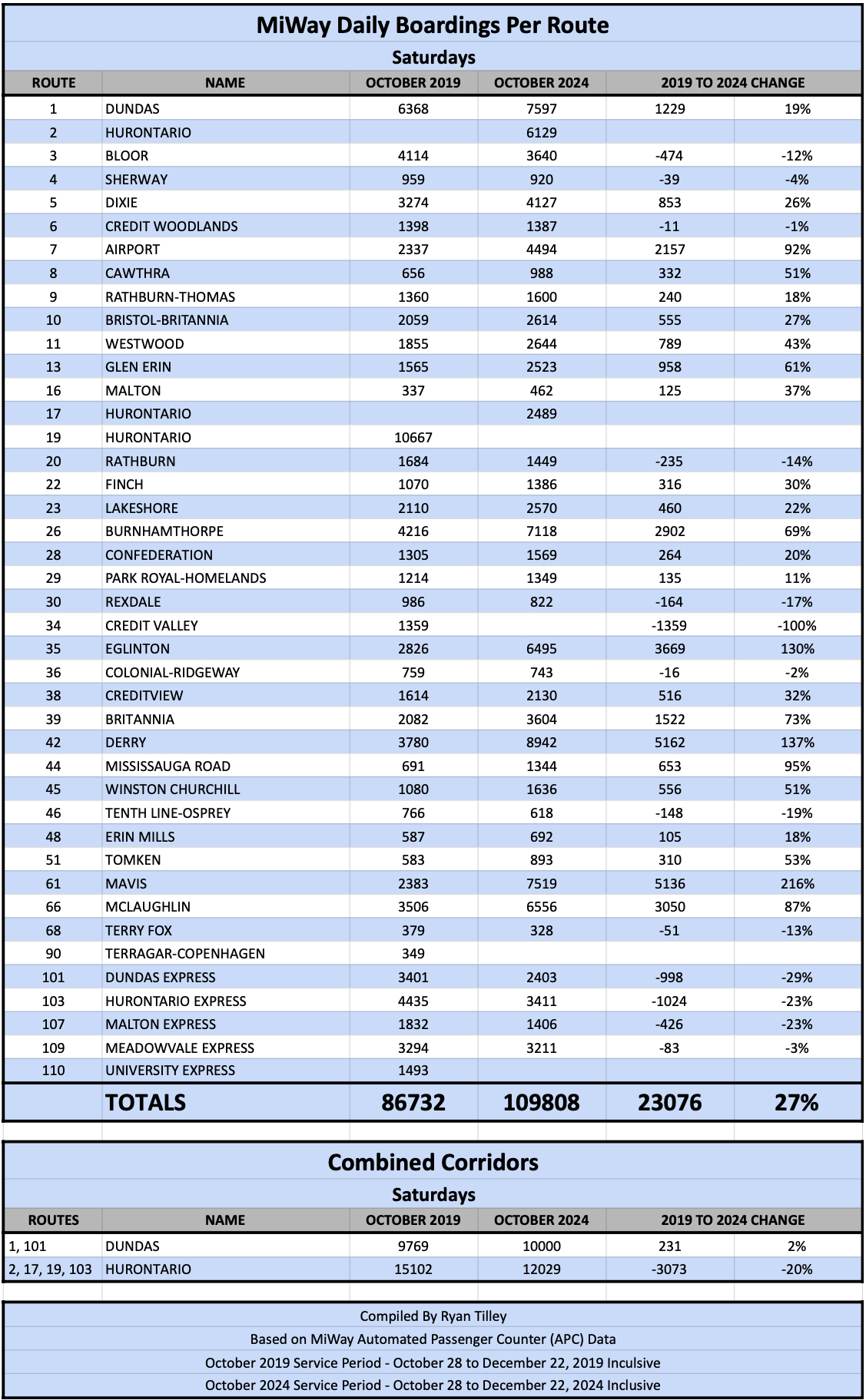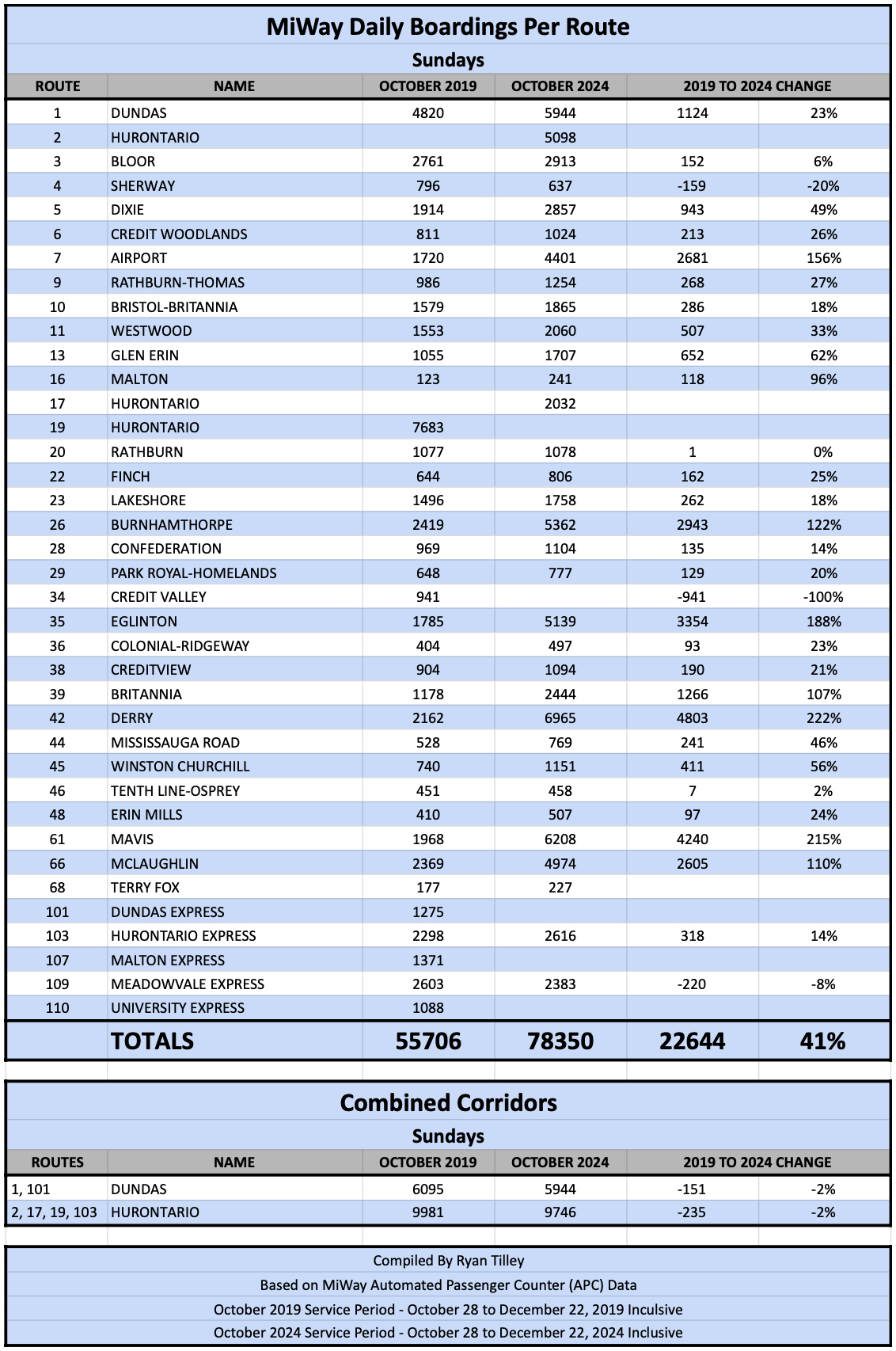 • In the short to medium term if the boardings on the corridors that saw huge surges in ridership (Dixie, Derry, Tomken, Courtneypark, McLaughlin, Mavis etc.) holds it may actually be a good thing as these corridors have had so much service added, and MiWay can focus on improving service elsewhere in the network, especially in areas that have not had pre-covid levels restored.