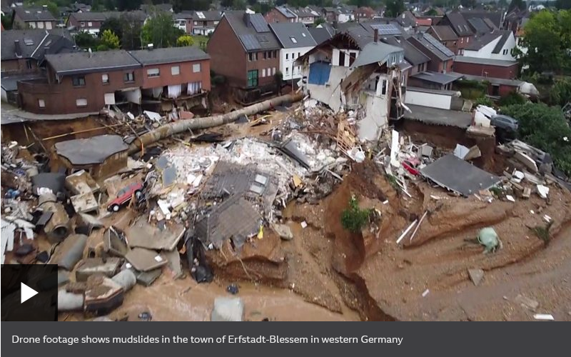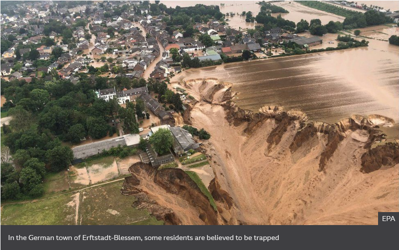 In the town of Erfstadt-Blessem, near Cologne, floodwaters caused a row of houses to collapse. Local authorities said they were receiving emergency calls from people trapped by floodwater but rescue was in many cases not possible.