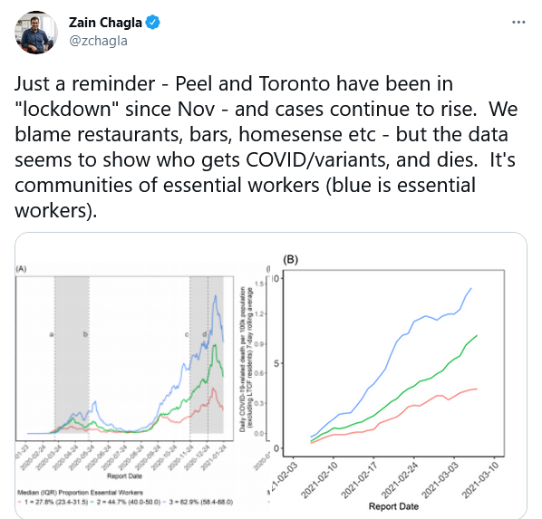 We've already vaccinated most if not all long term care residents and many seniors and others in the general population and as a result deaths in Ontario are very low now. So as we keep vaccinating the elderly until most of them have gotten a shot, why would everyone else need to get a shot when they're barely affected after all this time?