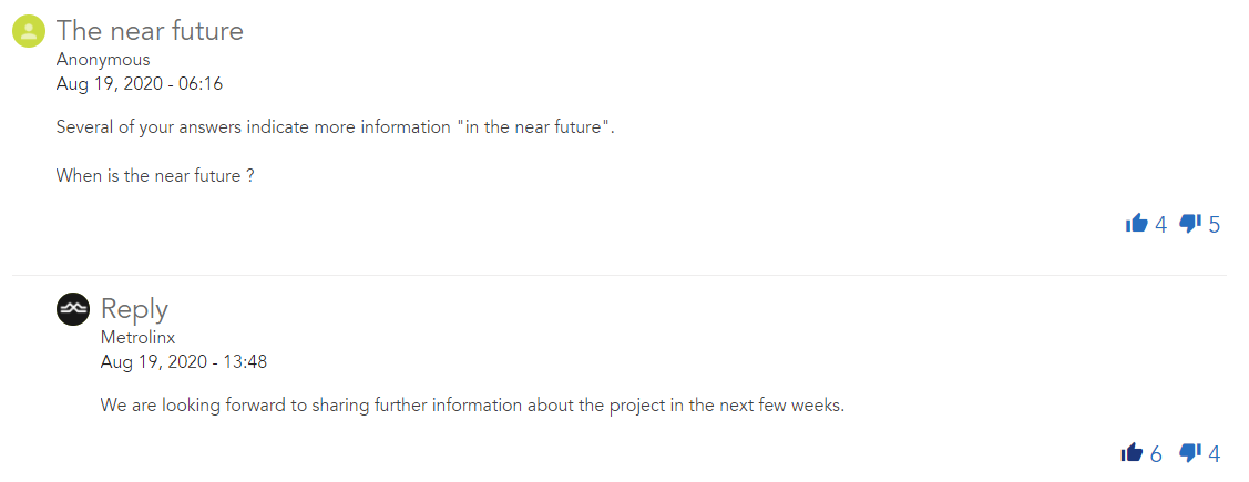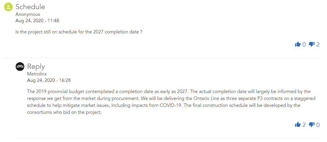 Next, someone asked if the line was still on schedule for 2027. Metrolinx noted that the 2019 provincial budget contemplated a completion date as early as 2027. But the actual start of construction and completion date would depend on the consortiums who will bid on the project. So don't expect the line to open in 2027. Unless a miracle happens.