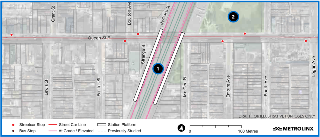 Once question is whether there will be separate station houses for each platform or will there be one station house on the former railway station site on De Grassi and a tunnel through the embankment or overhead over the tracks to the eastbound platform. That would eliminate the need for a station house next to the Jimmie Simpson Rec Centre.