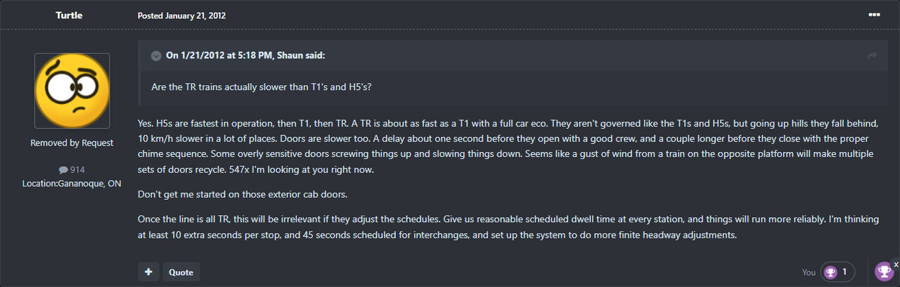 Not true. The acceleration and deceleration rates are not vastly different to most modern subways.- The TRs are slow compared to modern metro construction, which puts pressure on headways as well.