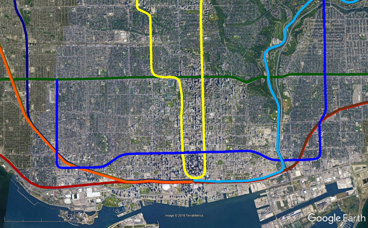 Normally when people talk about where they relief line should go next, the thought is always north or up the Weston tracks to Mount Dennis. But what about turning west there on either St. Clair, Dundas, or in between? It's got pretty good density to Jane. Mount Dennis will already be well-served with GO, UP, and the Eglinton line. Perhaps one day it can go west into Mississauga. Meanwhile turn Line 2 north to the Airport via Renforth station. I guess this is in fantasy map territory ...