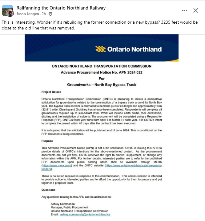 You can sort of see it and the old CN ROW in the centre of the image (Old Callander Rd. is off-screen to the lower right). The old CN ROW runs lower right to upper left and ONR runs lower left (yard and shops to upper right (station). The notice says clearing and grubbing has already been done, which must be fairly recent since I was poking around there about a month ago. I'll have to take a look.