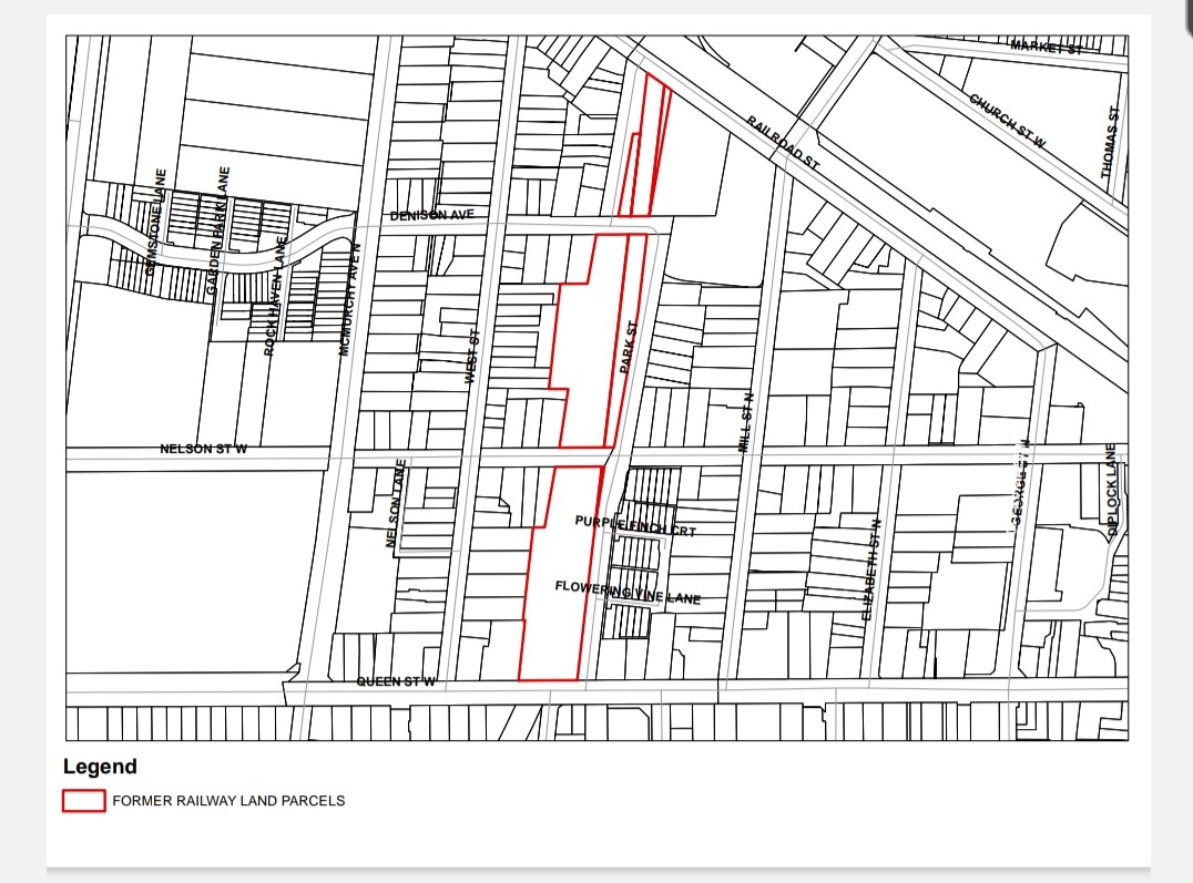 Yes, everything between Queen and Railroad - see the attachments quoted below. The land includes the former Peel Ice & Fuel depot, which surely would be contaminated from all the heating oil and coal that was distributed there.