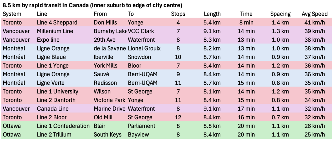 To expand on this, I compared the Trillium Line from South Keys to Bayview (the urban portion of the line, 8.5 km) with other rapid transit lines going about 8.5 km from the inner suburbs to the edge of the city centre.