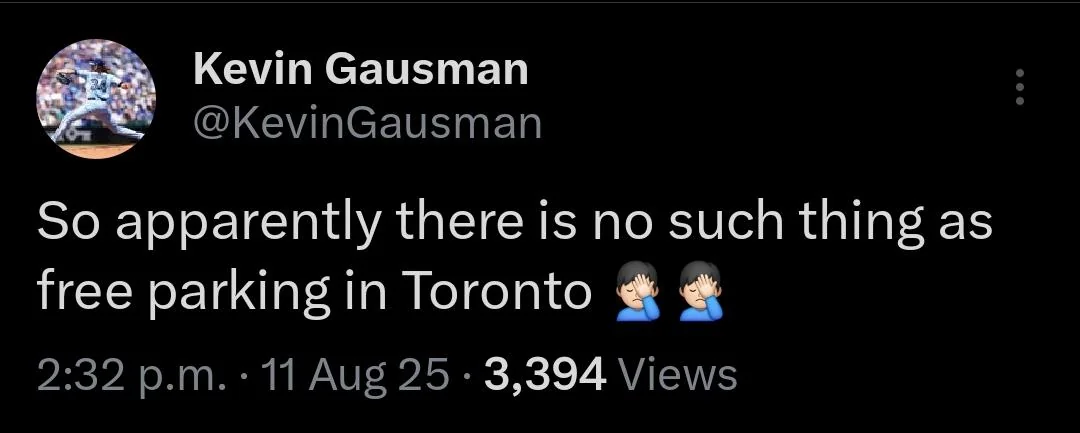 Either way, Gausman has been with the Jays for four years now, so this parking thing isn't new. He's previously played for San Francisco, Cincinnati, Atlanta, and Baltimore, so take a wild swing at which one(s) of those offer free parking in their cities.