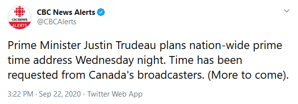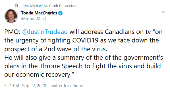 Bloc Quebecois leader Yves-François Blanchet has tested positive for COVID-19. In a statement, he says he feels fine but will stay in isolation at his home in Shawinigan until Sept. 26...meaning he'll miss the Throne Speech next week.