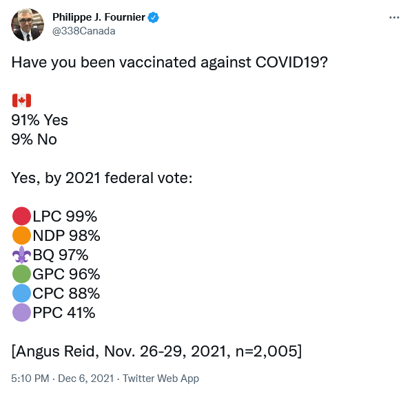I am impressed that the CPC is at 88% given how many of their elected members are catering, or at least pandering to the unvaccinated. I expected it to be much lower, like 75%, but I guess those Conservatives wound up voting PPC in the last election, and the Conservatives making the fuss want and/or need them back in the fold to stop vote splitting and local losses.Worth bringing that Tweet forward: