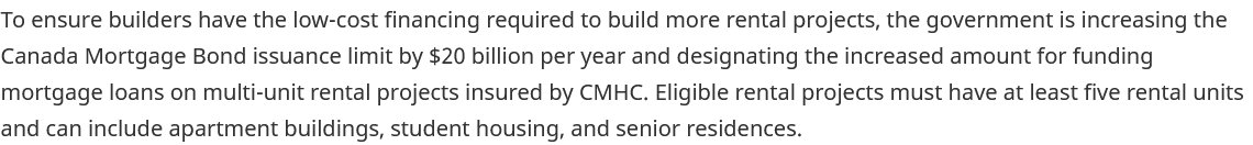 Freeland out to announce on behalf of the Feds, that CMHC will back an additional 20B in mortgages each year, with low-interest loans, these funds to be used to finance purpose-built rental, seniors housing and student housing.
