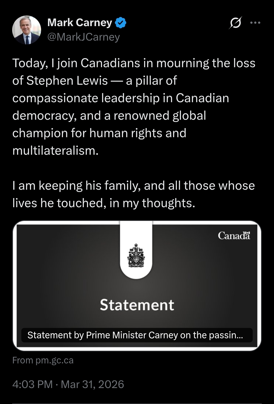 The Prime Minister has put out a statement of condolences following the death of Stephen Lewis, former leader of the Ontario NDP and father of NDP Leader Avi Lewis