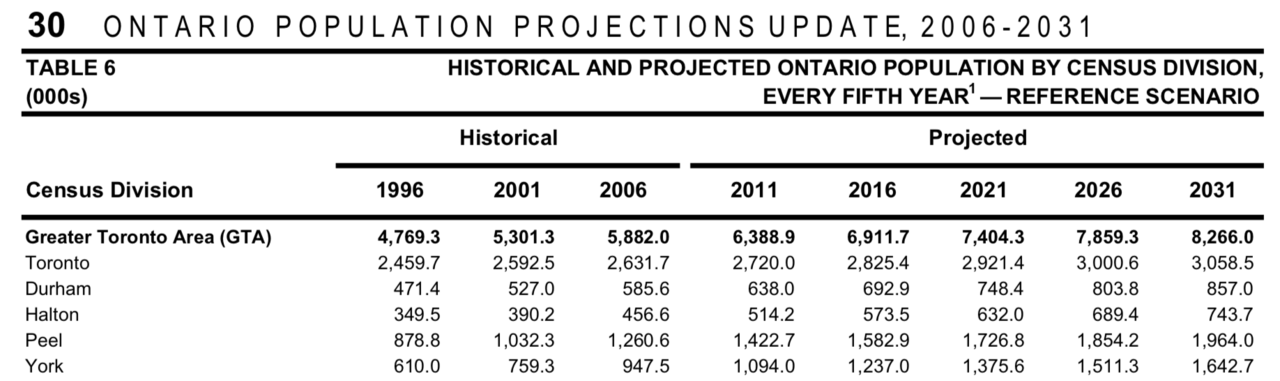 Looking elsewhere in the 2006 report, we can see how severely the Province has underestimated the growth of the City of Toronto. The city was projected to add approximately 15,000 people annually, to reach a population of 3.05 Million in 2031. We've now exceeded the 2031 target in 2018-2019, growing by 28,000 people annually, nearly 2x faster than the projections produced in 2006.