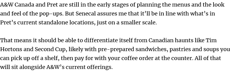 Susan Senecal, President and CEO of A&W, said the partnership with Pret allows the foodservice giant to test offering the best of Pret at A&W restaurants in about 12 to 15 locations starting in 2022 “to introduce Canadians to the great taste, the great ingredients and the great products that Pret offers.”