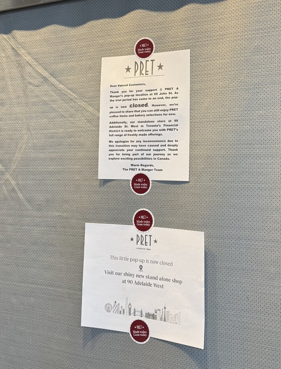 As someone who got lunch out of that A&W/Pret often-ish, I liked having the Pret options in that A&W. It was nicer than just getting yet another chicken burger. But they're delusional if they think I'm gonna walk 10-15 minutes each way to the store on Adelaide.View attachment 613839