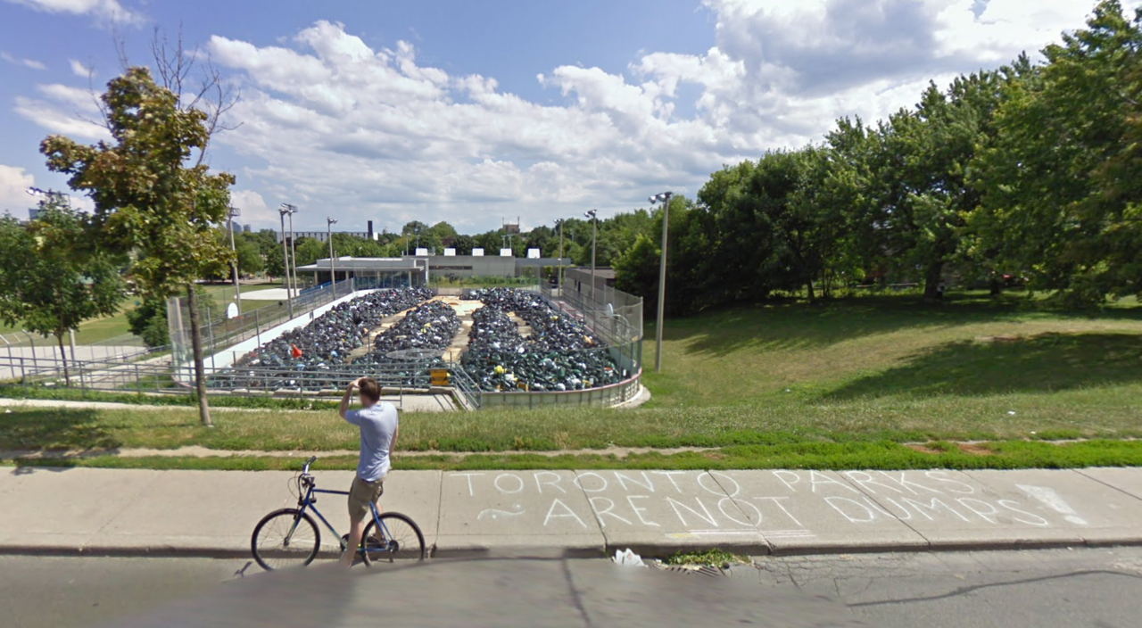 We'll start our tour at what I think is or ought to be seen to be the principle entrance to Christie Pits Park at the corner of Bloor and Christie, with a streetview pic from 2020: