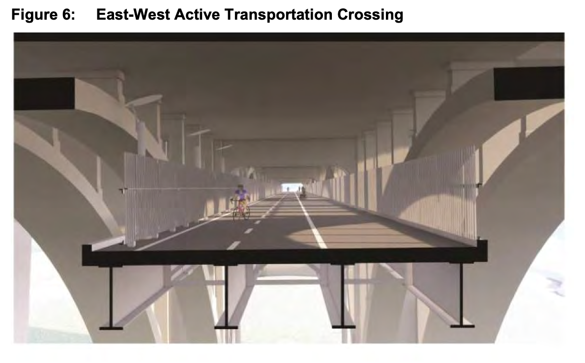 Does this graphic help? They are repurposing an old maintenance walkway beneath the bridge, according to the 2021 environmental assessment.
