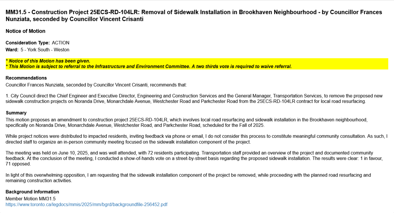God this is so depressing, first Pasternak with his sidewalk removal from a plan, then Colle with his removal of the planned Marlee Bike Lanes, now Nunziata with her cancellation of all these planned sidewalks which would have genuinely created a sidewalk network in this neighbourhood.
