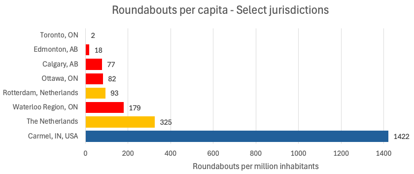 Waterloo Region's number of roundabouts per capita is closer to the Netherlands' than it is to Toronto's. But Waterloo actually uses roundabouts in places where the Netherlands would use a traffic signal, namely large intersections with lots of traffic and pedestrians crossing at-grade. The Netherlands has far more single-lane roundabouts, often in rural areas. There are surprisingly few roundabouts in rural areas in Waterloo Region considering how much safer they are in that context and how much experience the Region has with building roundabouts.