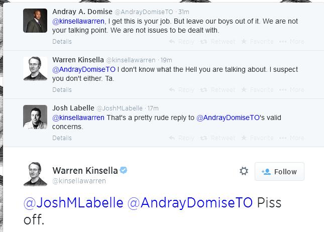 Yep, that's me being told to piss off for what I thought was a pretty innocuous comment. For context, Andray Domise was talking about Olivia Chow participating in "dog whistle politics" for white people by bringing up guns and gangs when gun crime is on the decline. Warren Kinsella obviously didn't think this was a valid line of conversation.