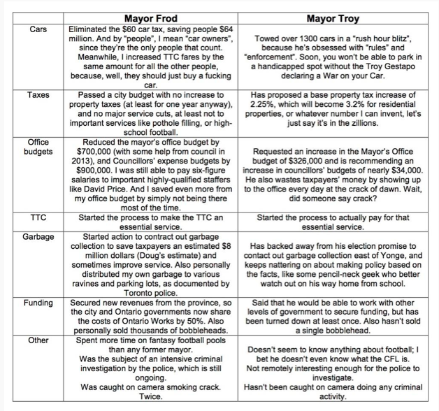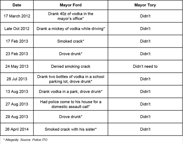 To be fair, Tory's only been on the job for 101 days. Let's come back after one year and see if he's smoking hash to deal with the stress at City Hall, or at least battling a crippling addiction to cough syrup![]()