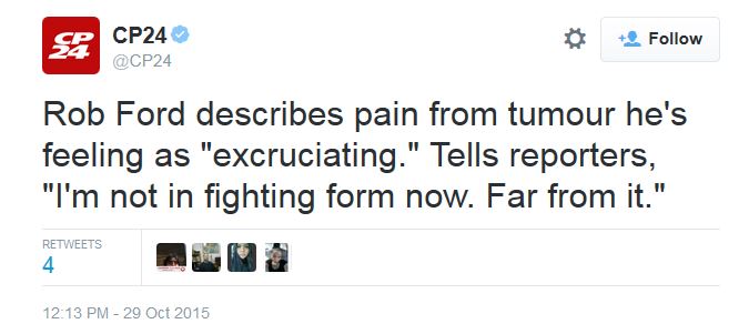 http://www.cbc.ca/news/canada/toronto/rob-ford-tumour-1.3294613Toronto city councillor and former mayor Rob Ford says he is "99 per cent sure" a newly discovered tumour is "malignant."
