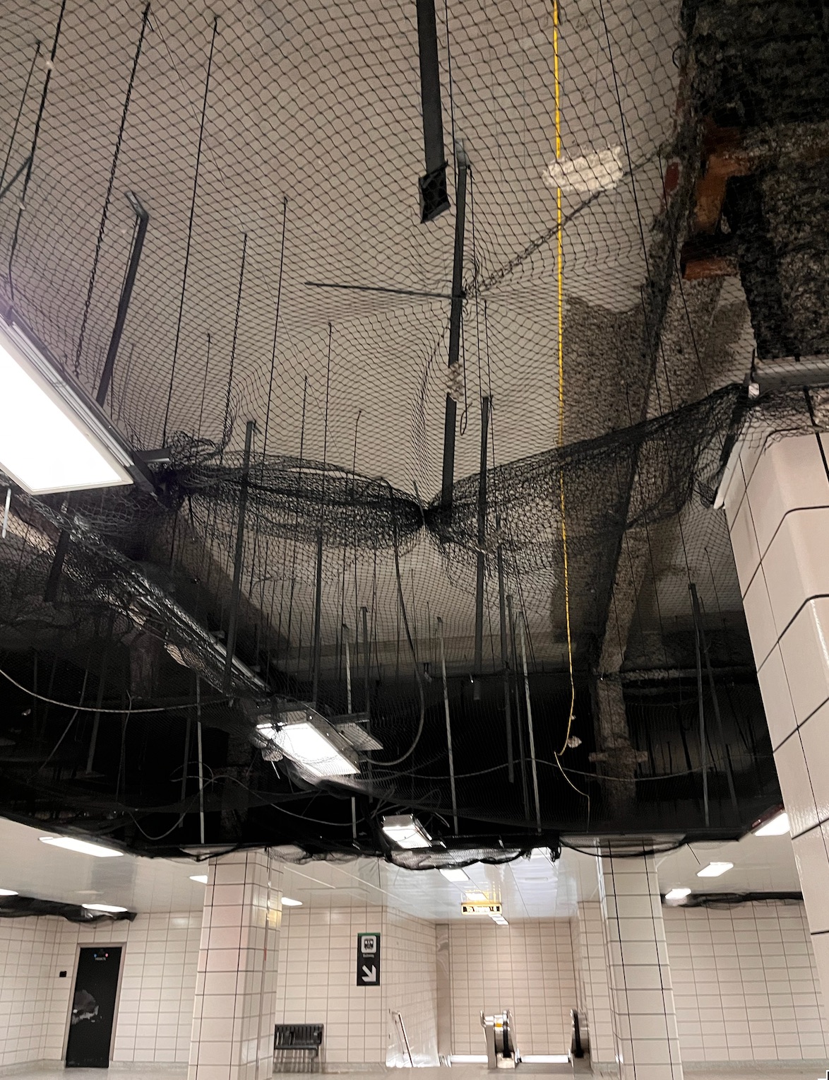 Remaining wall finish panels, and temporary lighting supports at platform level will be removed and disposed. New wall finish panels, ceiling, lighting, and surveillance system will be installed along with cosmetic upgrades.
