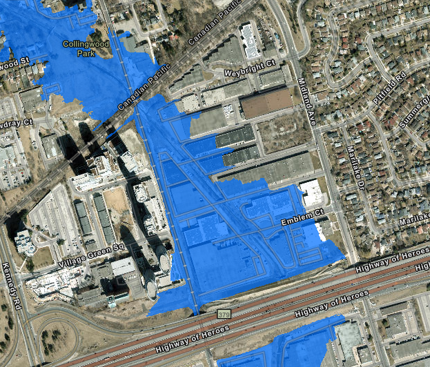 Once you're underground under the CP Mainline, you also have to stay under Highland Creek. Note then that if you brought the track up above grade between the creek and the 401, it would only feasible if you relatively shallow to begin with. But, there's a small problem............. You're going to emerge in the midst of the high-risk floodzone for the creek, which would make the tunnels vulnerable to water infiltration.