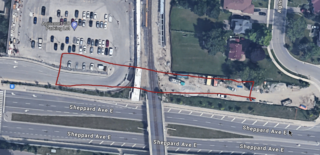Additionally, assuming you're continuing east in the Sheppard Corridor, you have the CP mainline only ~600M to the east.