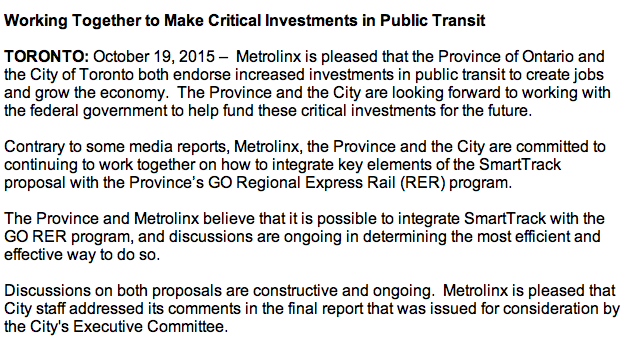 I'm wondering how much it has to do with Metrolinx and more to do with anti-Tory news reporters and papers misappropriating what Metrolinx is saying.