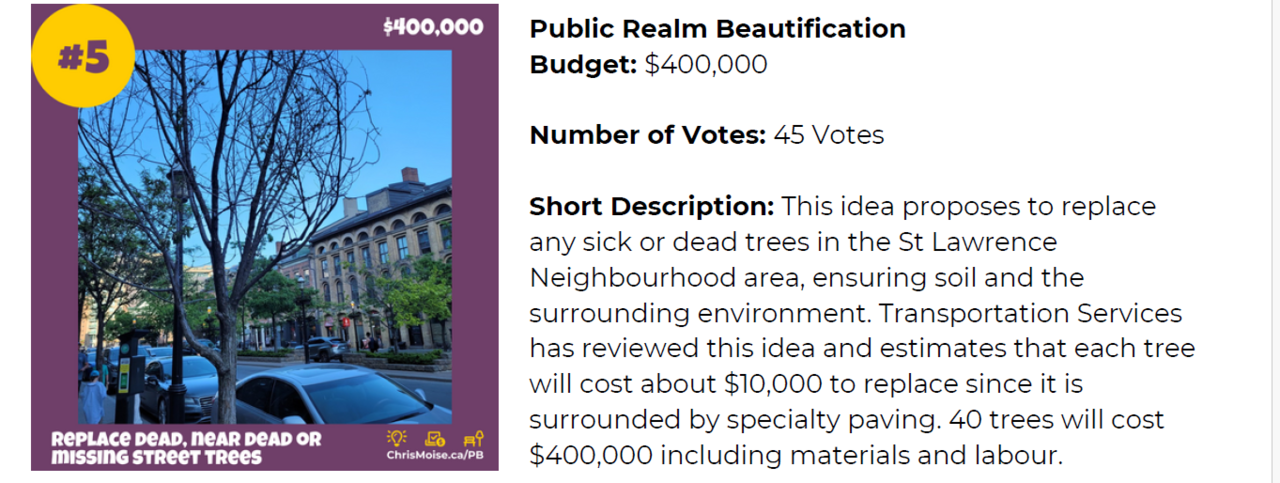 Chris Moise's December Newsletter notes the result of his Participatory Budgeting exercise. I have some doubt about the whole idea but find the City estiate for panting a tree to be preposterous! @Northern Light may want to enlighted is, and the Coucllor!