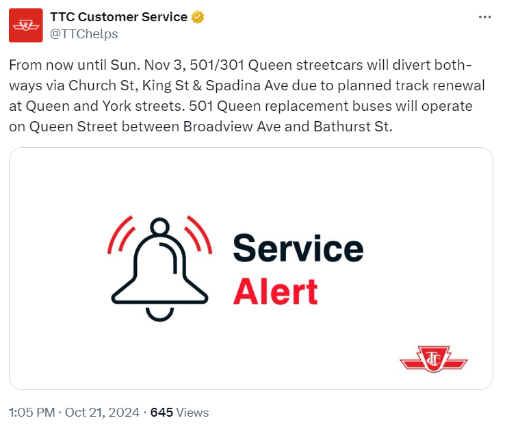 I'm puzzled how those service announcements jibe with their tweet this afternoon about detouring until November 3.For accuracy, the TTC posted a new notice (there are four at last count) listing the Church/King/Spadina diversion as running to "mid November". The previous date was "November 3".