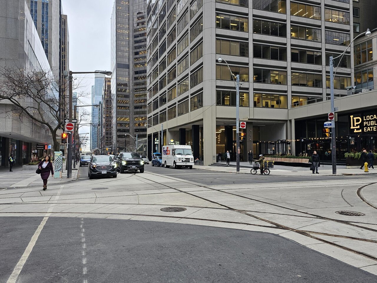 York & Adelaide has been complete for several weeks, as discussed in detail a few days ago, the track ON Adelaide between York and Victoria has two gaps. One from Sheppard to Bay and one just west of Victoria - in both locations the utility work has finished (or is no longer on/under the future track) and TTC can return to finish track laying. The 'problem area" is on York from about 20 metres north of Adelaide to Queen and includes the southbound curve from Queen. As of last week, there is no overhead from Charlotte (at Spadina) to Victoria or on York north of King - though most poles seem to have been installed.January 30: The track work for Adelaide and York intersection looks close to, if not already complete. No overheads though. Going up from Adelaide though, the southbound track is still in the preliminary stages, with lots of preparation activities underway, but no track in place yet. First, the Adelaide intersection, and then from Queen Street heading south.