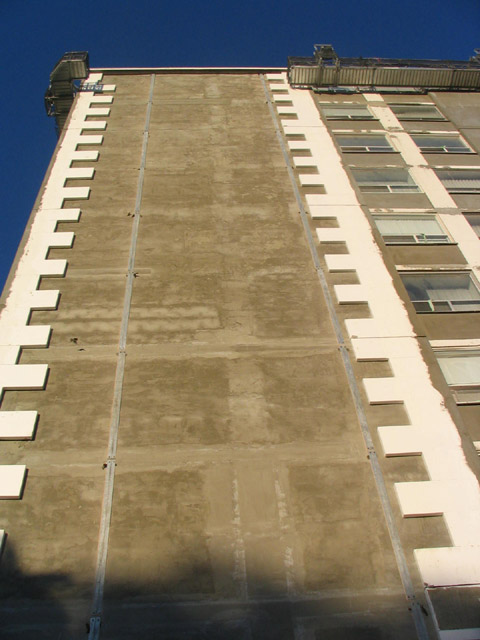 Not that I like it but surely they are only part-way through this process. To date they seem only to have put the Styrofoam on the edges and I assume will soon fill in the middle and cover it with cheap stucco. (Though I hate the look and it won't last, it DOES actually offer a way to insulate buildings from the outside. )The EIFS menace aside, take a look at how bad they've screwed up the pattern on the left side vs right side - unless it's intentional?????