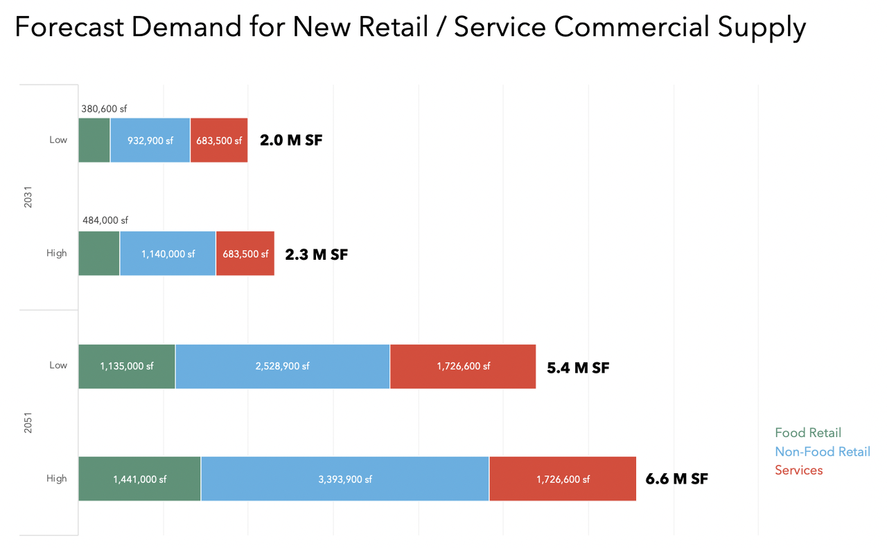 This is the breakdown of how much retail Mississauga needs added in net terms city-wide in the next 5 years and the next 25 years, broken down by type of retail. Note that the city already has 30.5 million square feet of retail. The chart below shows that it needs to add 2 million square feet in the near future to keep up with demand from a growing population.