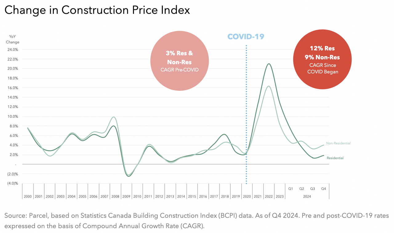 This shows how construction costs in Canada have risen, expressed as a percentage change over the previous year. Construction costs have gone up from the previous year almost every year, which makes retail construction more expensive.