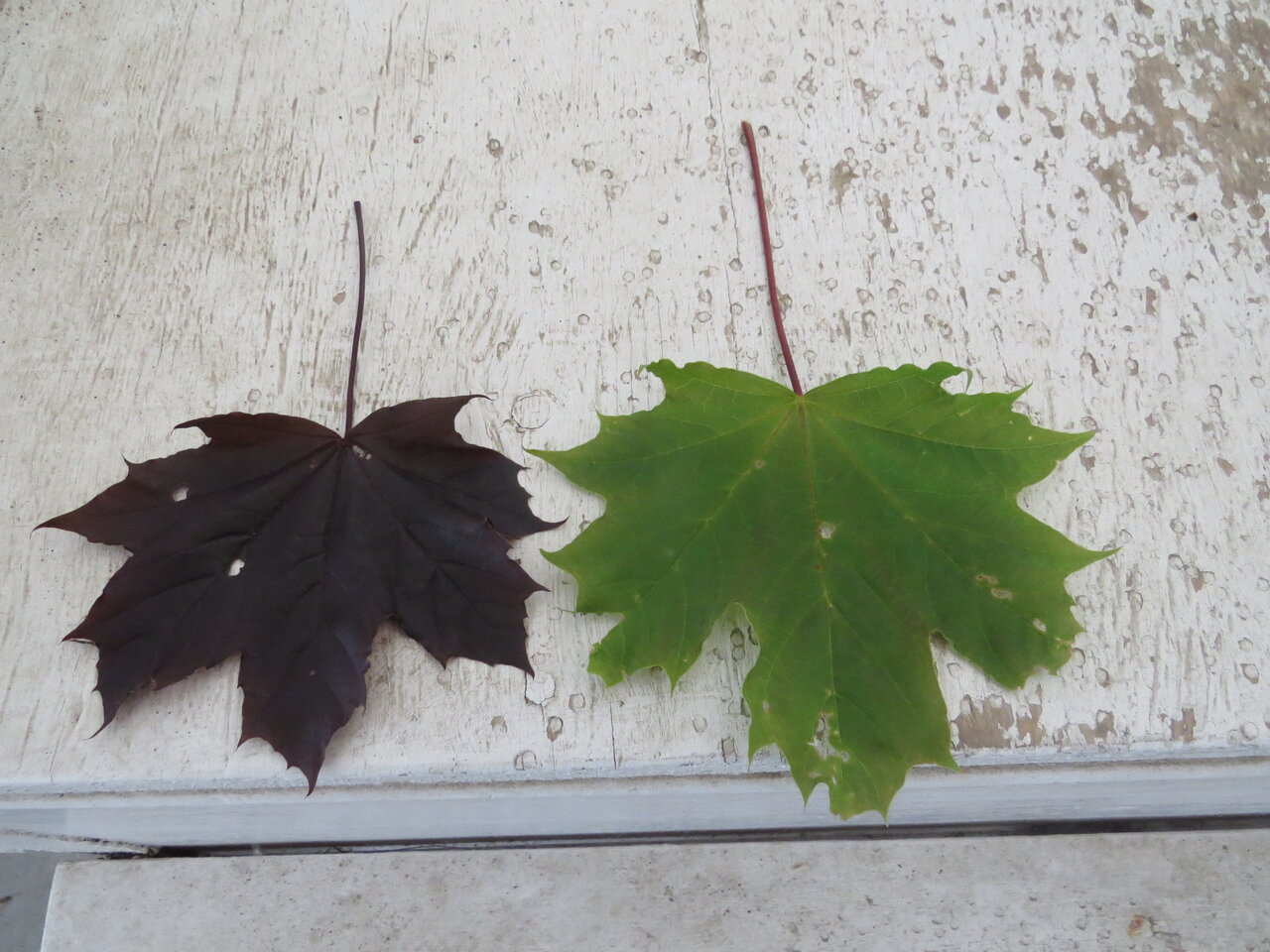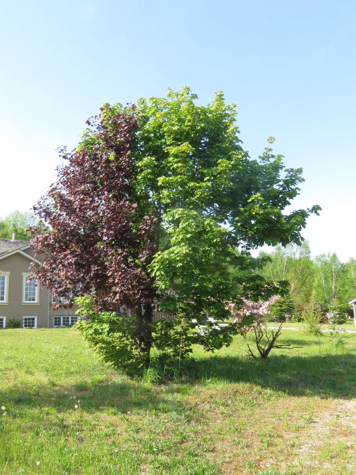 Best I can figure, it is some kind of clone of a Norway Maple and a Crimson King Norway Maple variant. There are two main trunks, one for each 'colour'; the green side is larger and represents about 2/3 of the foliage.