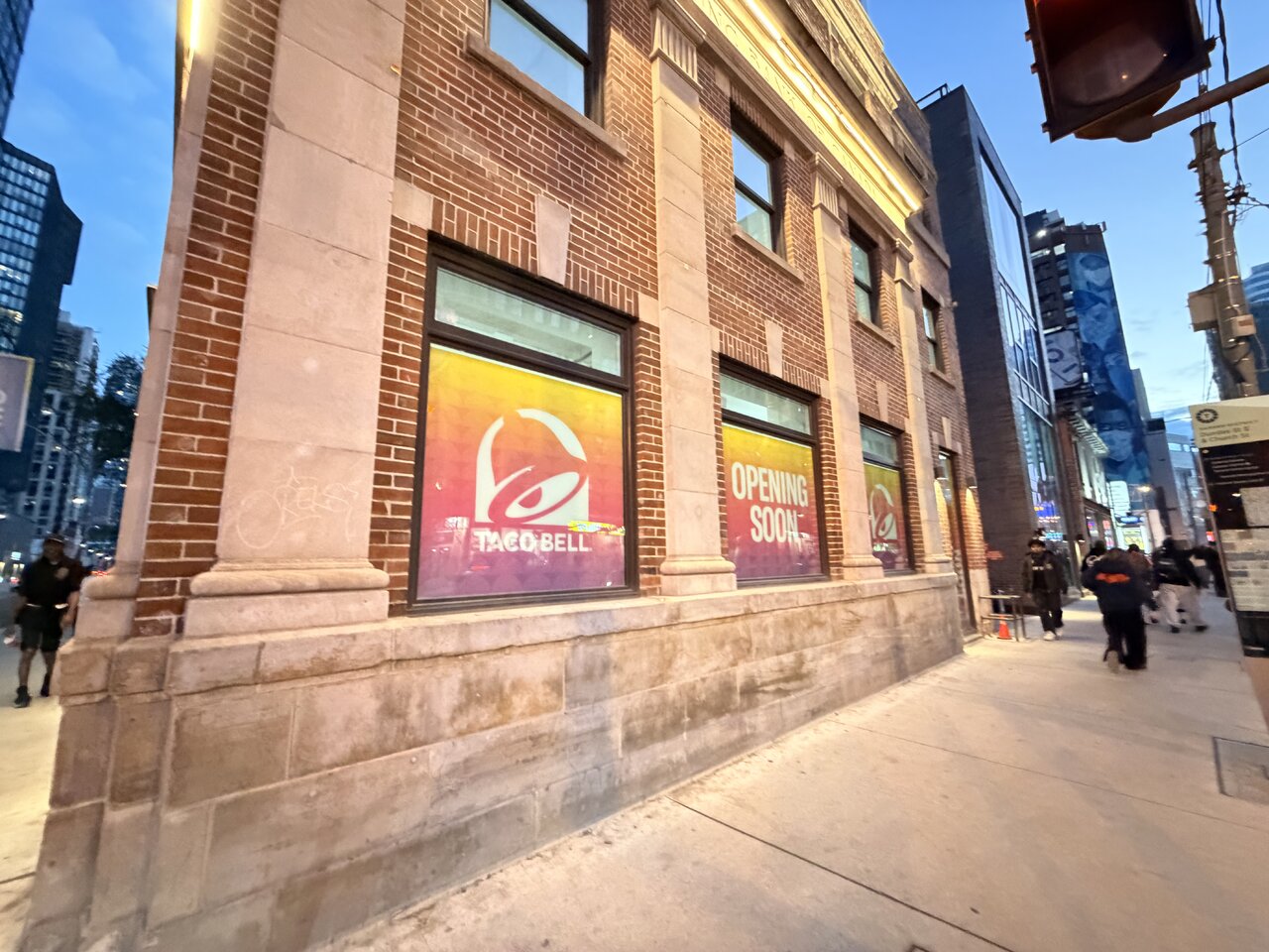 I'd argue Pizza Pizza is worse in that they actively turn the exterior of heritage buildings into cheap orange crap. But yeah, in terms of food, not a major improvement. But hey, we got the heritage building restored so like, small wins.I joked that when Tacos 101 was closed to make way for the Social crapola by Pemberton, it’d end up being replaced by Taco Bell. I wasn’t that far off the mark.