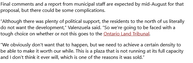 At last night's committee of the whole public meeting, this application as it was presented, was unanimously rejected by council and the applicant has been ordered to conduct a community meeting (as 100% of the residents in the neighbourhood just to the north) opposed the development. There are way too many problems/issues/conflicts, etc. with the current application, and I suspect there will be many revisions until everyone is happy with the final outcome. We will need to wait and see what happens, however much lower density and building heights will have to be part of the final proposal. Current Official Plan allows for buildings with a max. 8 storey height.