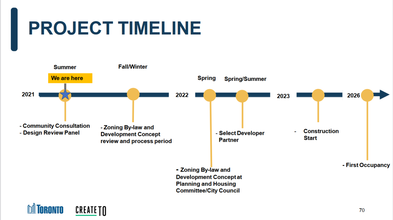CONSTRUCTION TIMELINE : From CreateTO slides this week (Construction starts 2024, First Buildings become available in 2026, Completed by approx ~2028), order of buildings has not been defined yet.