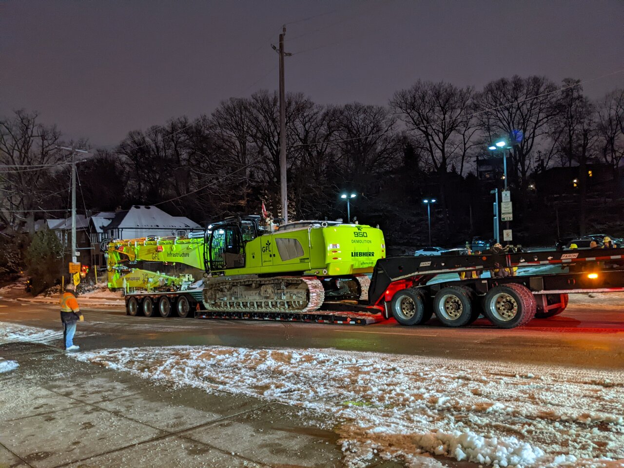 As you can see, there were a lot of dump trucks lined up and some new equipment being unloaded. Although I did not see a scoop, I think it must have been an excavator on the flatbed - to help fill up all the dump trucks. I am not sure if they are just carting away construction debris, or about to start digging down. Regardless, it seems like things are about to enter a new stage here