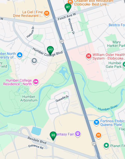As as Finch/Westmore, Humber College, and Woodbine Mall: